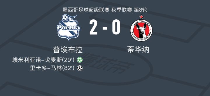 普埃布拉2-0蒂华纳,埃米利亚诺-戈麦斯建功,里卡多-马林锦上添花