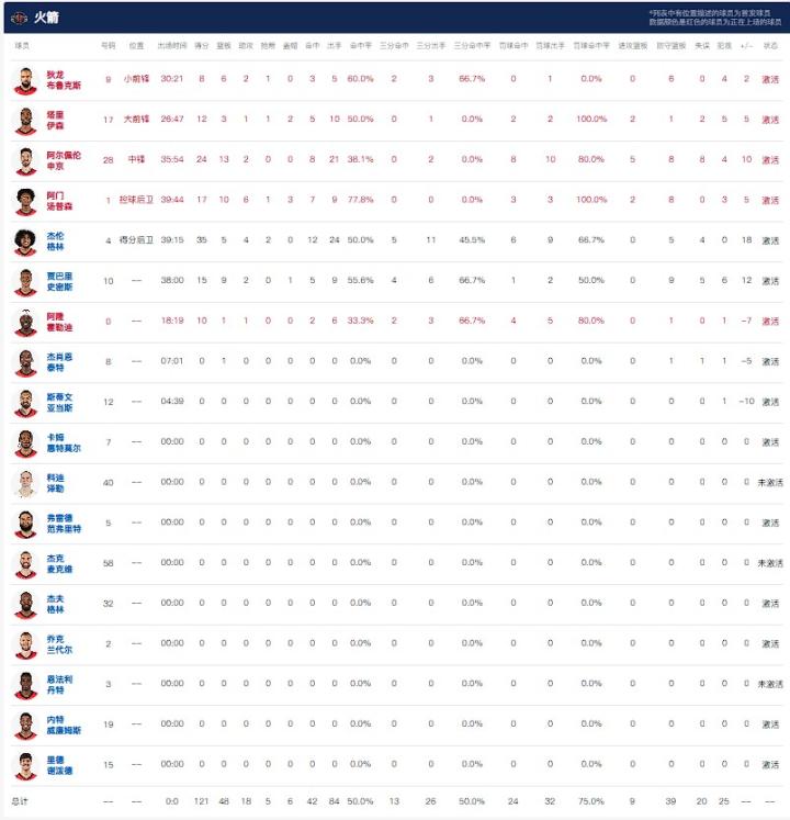 休斯顿火箭杰伦-格林35分5板4助,申京24分13板2助,阿门17分10板6助;