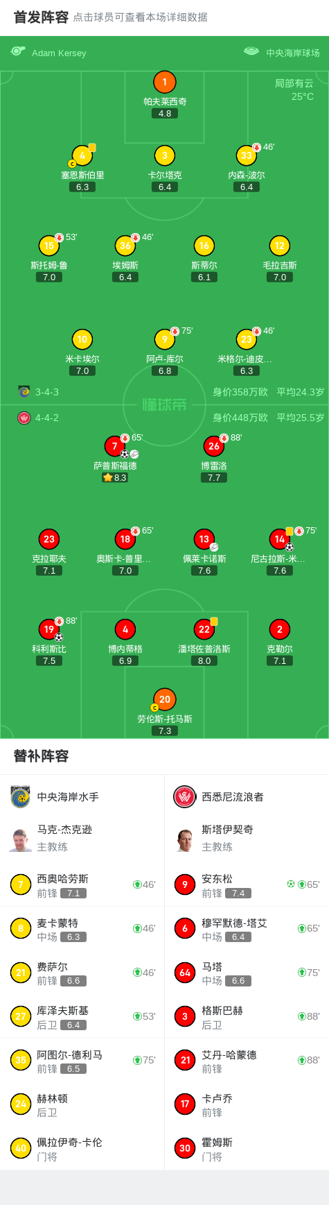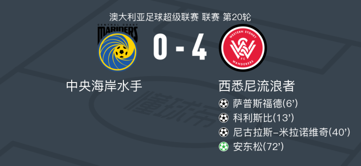 北京时间2月22日澳大利亚足球超级联赛 联赛 第20轮,中央海岸水手主场对阵西悉尼流浪者。西悉尼流浪者萨普斯福德破门,科利斯比破门,尼古拉斯-米拉诺维奇破门,安东松破门。最终比分中央海岸水手 0-4 西悉尼流浪者。