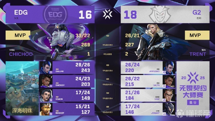 北京时间2月22日,无畏契约曼谷大师赛瑞士轮继续进行,CN赛区头号种子EDG 2-1力克美洲赛区头号种子G2,以两连胜的姿态挺进四强!