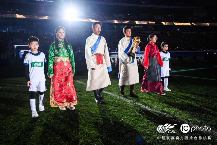 作为2025赛季中超开幕式的主办方,上海申花足球俱乐部多年来一直在公益之路上执着深耕, 用爱与责任铺就温暖的前行轨迹。今晚,俱乐部特意把四名来自西藏日喀则定日县的藏族小朋友们带到了开幕式的现场,和两位汉族小朋友一起,将金光灿灿的“火神杯”传递给中国足球职业联赛联合会副理事长杨旭手中。