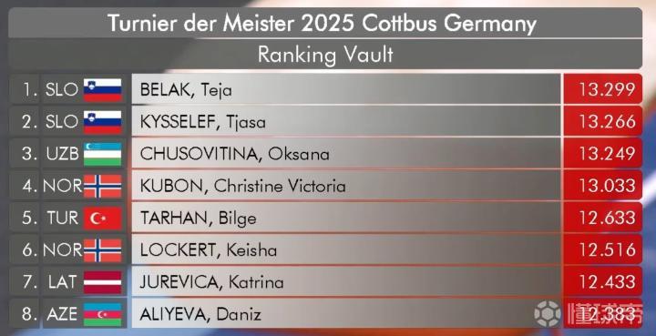 在此前跳马资格赛中,丘索维金娜排名第二。而在决赛中,丘索维金娜拿到13.249分,获得第三名。两名斯洛文尼亚选手分获前两名。