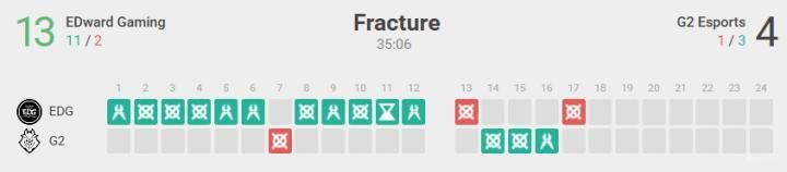 EDG在图一苦战五加时落败的情况下,顽强地扳回图二,并在决胜图上半场11-1单方面碾压G2,一度12-1领先获得11个赛点,彻底击碎对手的翻盘希望。