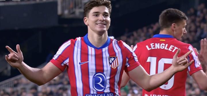 此役客场对阵瓦伦西亚,首发出战的阿尔瓦雷斯在比赛第12分钟和第30分钟各入一球,帮助马竞取得2-0领先。