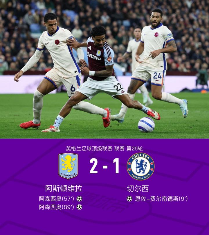 北京时间2月23日1:30,英超第26轮,切尔西客场挑战阿斯顿维拉。上半场,查洛巴受伤被换下,恩佐-费尔南德斯抢点破门,沃特金斯小角度打门被门将挡出,恩昆库兜射被门将扑出。下半场,拉什福德助攻阿森西奥扳平比分,帕尔默兜射打偏,比赛尾声阶段,拉什福德再次助攻阿森西奥破门,最终,切尔西客场1-2被维拉逆转遭三连败,阿斯顿维拉终结联赛五轮不胜。