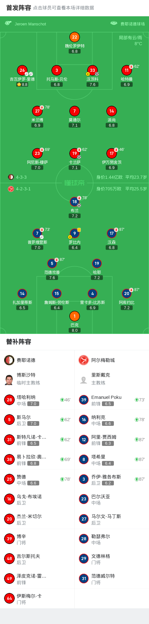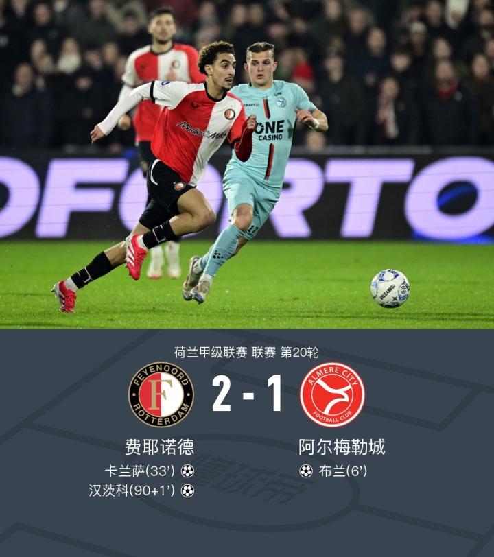 北京时间2月23日荷兰甲级联赛第20轮,费耶诺德主场对阵阿尔梅勒城。费耶诺德卡兰萨破门,汉茨科破门。阿尔梅勒城布兰破门。最终比分费耶诺德 2-1 阿尔梅勒城。