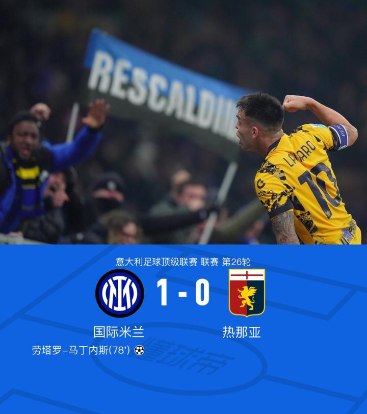 北京时间2月23日意大利足球顶级联赛第26轮,国际米兰主场对阵热那亚。上半场,两队均无建树。下半场,巴雷拉怒射击中门框弹出。随后,恰尔汗奥卢开出角球,劳塔罗头槌破门。全场比赛结束,国米1-0小胜热那亚,在先赛的情况下暂时超越那不勒斯登顶意甲联赛。