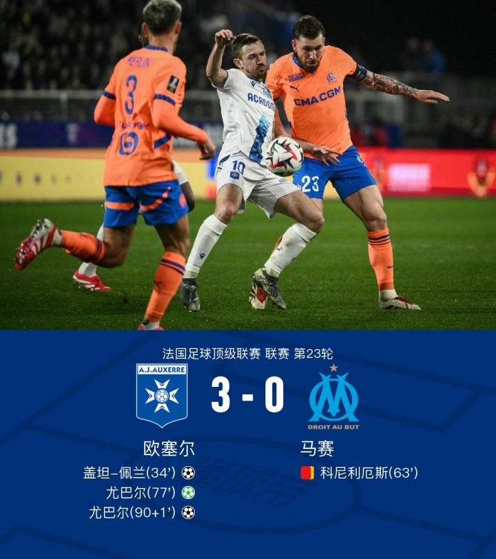 北京时间2月23日法甲第23轮,欧塞尔坐镇主场迎战马赛。上半场,哈米德-特拉奥雷助攻,盖坦-佩兰破门打破平衡。越位在先,西奥-贝尔进球被吹。下半场,科尼利厄斯防守犯规,吃到第二张黄牌被罚下。随后,尤巴尔连续进两球完成双响。最终欧塞尔主场3-0战胜马赛。