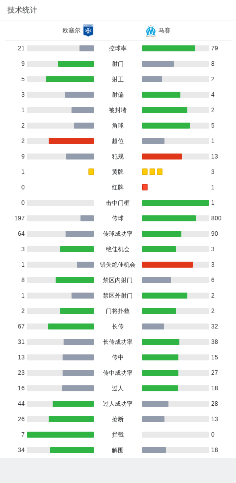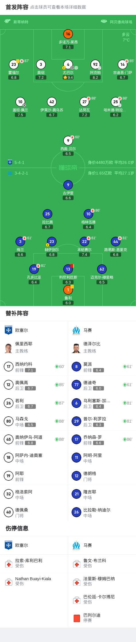欧塞尔3-0十人马赛,盖坦-佩兰建功,尤巴尔双响,科尼利厄斯染红