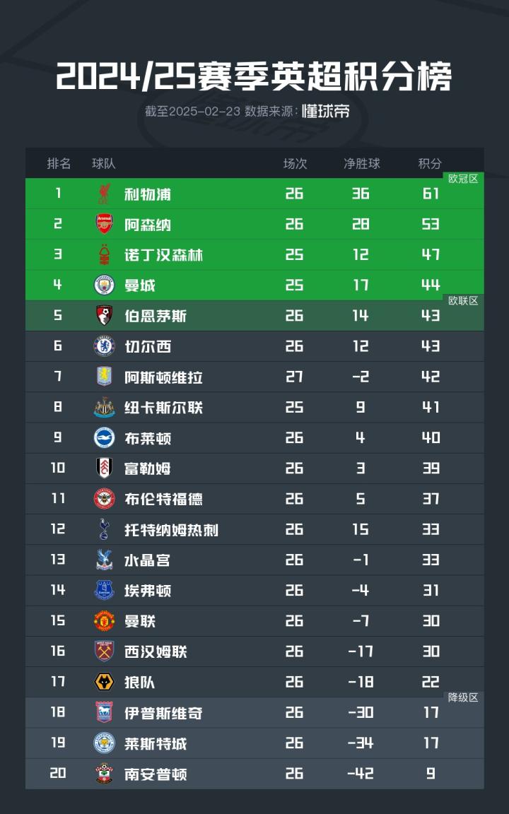 积47分排名第三的诺丁汉森林本轮将客场对阵纽卡,伯恩茅斯和切尔西本轮均遭遇失利,同积43分继续排名第五、第六。
