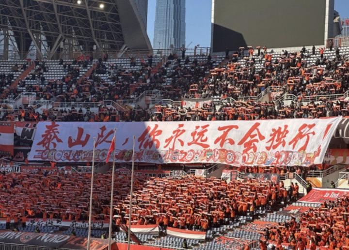 山东球迷挂出TIFO支持球队:泰山队,你永远不会独行LaPulga @懂球帝2025-02-23 16:12在山东泰山对阵河南队的中超第一轮比赛中,山东泰山球迷在主场打出了TIFO支持球队。2月23日山东泰山队迎来新赛季首战,他们在主场对阵河南队。《济南时报》表示,不少球迷现场观战,几乎座无虚席,球迷们还在看台挂出一幅巨幅TIFO很是亮眼,上面写道:“泰山队,你永远不会独行。”不过山东泰山在本场比赛中的开局并不顺利,球队门将王大雷在上半场比赛中就被红牌罚下。展开更多
