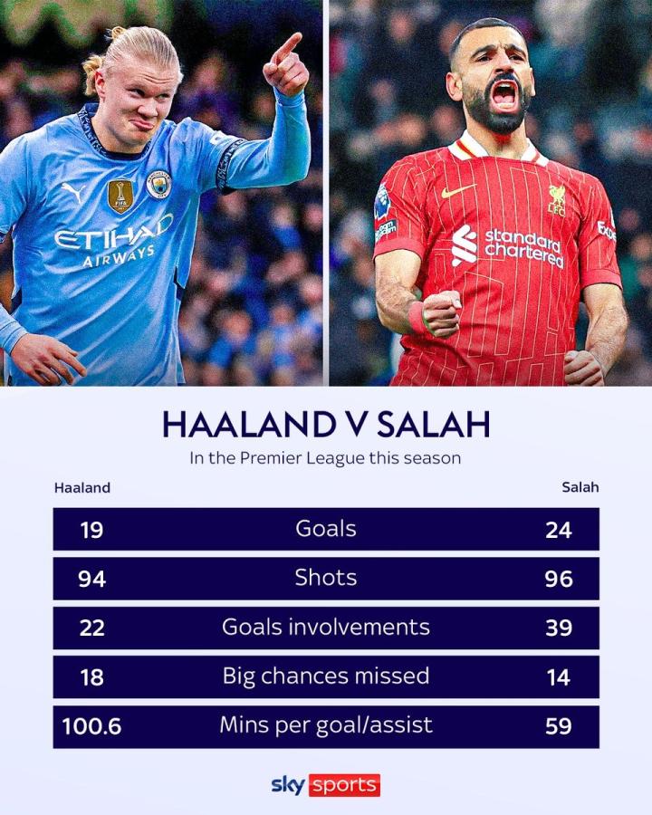 英超第26轮,曼城将主场对阵利物浦,赛前,英国天空体育对比了哈兰德和萨拉赫本赛季英超数据,后者效率明显更出色。