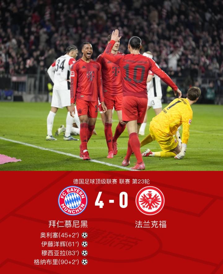 北京时间2月24日德国足球顶级联赛第23轮,拜仁慕尼黑主场对阵法兰克福。上半场尾声阶段,萨内突破送助攻,奥利塞轻松破门。下半场,伊藤洋辉角球破门,格纳布里打门将小门入网,穆西亚拉半场奔袭一条龙破门。最终比分拜仁 4-0 法兰克福。