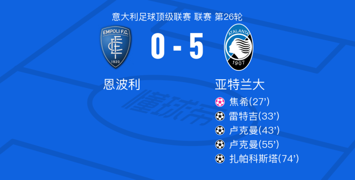 北京时间2月24日意大利足球顶级联赛 联赛 第26轮,恩波利主场对阵亚特兰大。恩波利焦希自摆乌龙。亚特兰大雷特吉破门,卢克曼梅开二度,扎帕科斯塔破门。最终比分恩波利 0-5 亚特兰大。