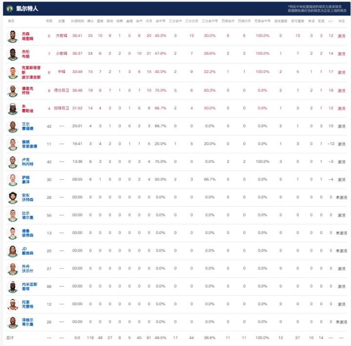 波士顿凯尔特人塔图姆25分10板9助1断,杰伦-布朗24分8板2助2断,德里克-怀特19分9板7助1断;