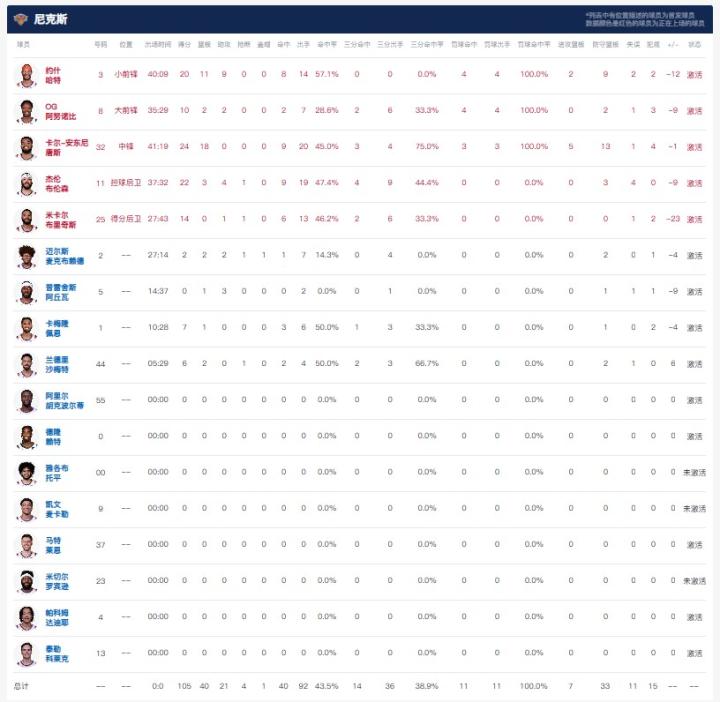 纽约尼克斯唐斯24分18板,布伦森22分3板4助1断,约什-哈特20分11板9助。