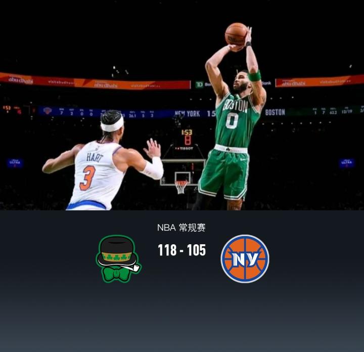 凯尔特人118-105尼克斯取NBA5连胜,塔图姆25+10+9,唐斯24+18