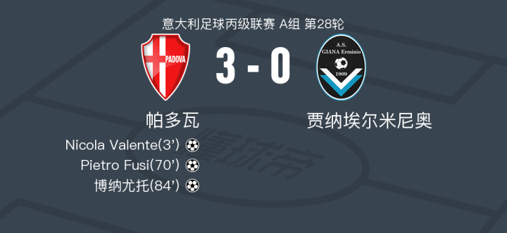 帕多瓦3-0大胜贾纳埃尔米尼奥,博纳尤托、Pietro Fusi破门