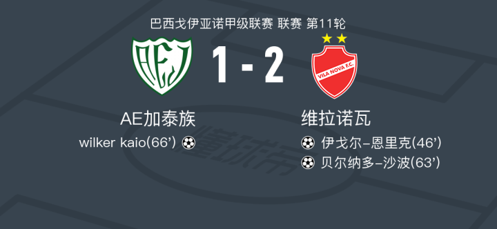 北京时间2月24日巴西戈伊亚诺甲级联赛 联赛 第11轮,AE加泰族主场对阵维拉诺瓦。AE加泰族wilker kaio破门。维拉诺瓦伊戈尔-恩里克破门,贝尔纳多-沙波破门。最终比分AE加泰族 1-2 维拉诺瓦。
