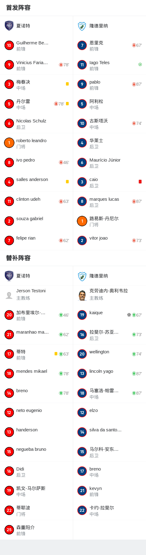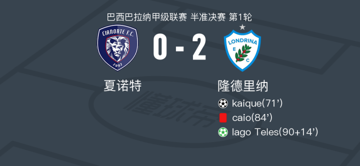 北京时间2月24日巴西巴拉纳甲级联赛 半准决赛 第1轮,夏诺特主场对阵隆德里纳。隆德里纳kaique破门,Iago Teles破门。最终比分夏诺特 0-2 隆德里纳。