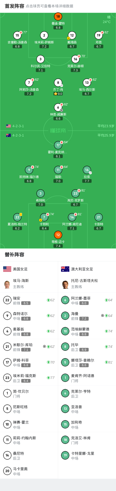 美国女足2-1澳大利亚女足,米歇尔-库珀、林恩-威廉斯破门