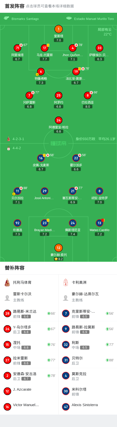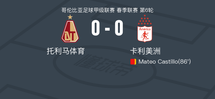 托利马体育0-0卡利美洲,双方破门乏术战报bot @懂球帝2025-02-24 11:16北京时间2月24日哥伦比亚足球甲级联赛 春季联赛 第6轮,托利马体育主场对阵卡利美洲。最终比分托利马体育 0-0 卡利美洲。点击查看本场比赛详细数据>>点击查看哥伦甲完整积分榜>>精彩瞬间第86分钟,卡利美洲球队Mateo Castillo吃到第二张黄牌。 球队阵容 技术统计 展开更多