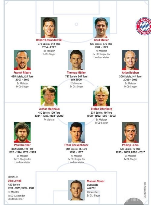 踢球者评拜仁历史最佳阵容:贝肯鲍尔、盖德-穆勒、莱万在列JayStones @懂球帝2025-02-24 15:21在拜仁俱乐部即将迎来成立125周年之际,《踢球者》杂志评选了拜仁队史最佳阵容,其中莱万、盖德-穆勒、托马斯-穆勒、马特乌斯、贝肯鲍尔、布莱特纳、拉姆、诺伊尔均在列。《踢球者》评拜仁队史最佳阵容:前锋:莱万、盖德-穆勒中场:里贝里、马特乌斯、穆勒、埃芬博格、罗本后卫:布赖特纳、贝肯鲍尔、拉姆门将:诺伊尔主教练:拉特克展开更多