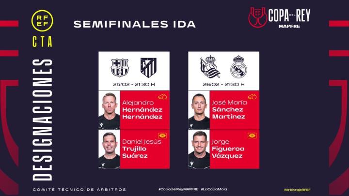 西班牙足协官方公布了国王杯半决赛首回合裁判安排,埃尔南德斯-埃尔南德斯将执法巴塞罗那vs马德里竞技,何塞-桑切斯将执法皇家社会vs皇家马德里。
