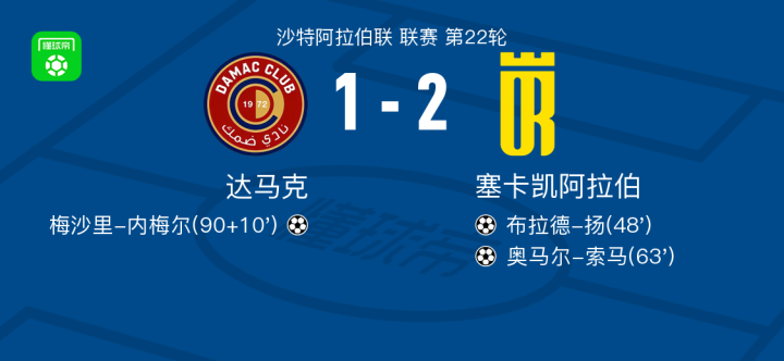 北京时间2月24日,沙特阿拉伯联赛第22轮,达马克主场迎战塞卡凯阿拉伯。比赛中,塞卡凯阿拉伯率先取得领先,布拉德-扬接队友助攻成功破门。随后,奥马尔-索马再度为塞卡凯阿拉伯扩大优势。尽管达马克在比赛尾声由梅沙里-内梅尔扳回一城,但最终未能改变局势。全场比赛结束,达马克以1-2不敌塞卡凯阿拉伯。