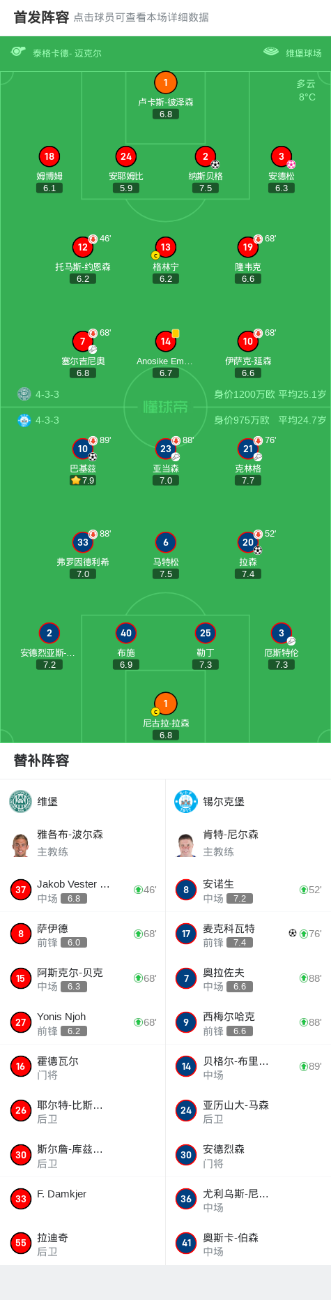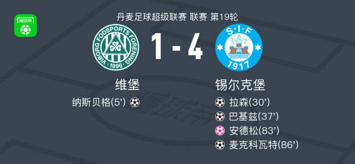 在北京时间2月25日进行的丹麦足球超级联赛第19轮比赛中,维堡主场迎战锡尔克堡。比赛中,纳斯贝格为维堡首开纪录,但随后锡尔克堡展开反击,拉森和巴基兹相继破门反超比分。之后,安德松不慎自摆乌龙,进一步扩大了锡尔克堡的优势。比赛尾声阶段,麦克科瓦特再入一球锁定胜局。最终,维堡以1-4不敌锡尔克堡。