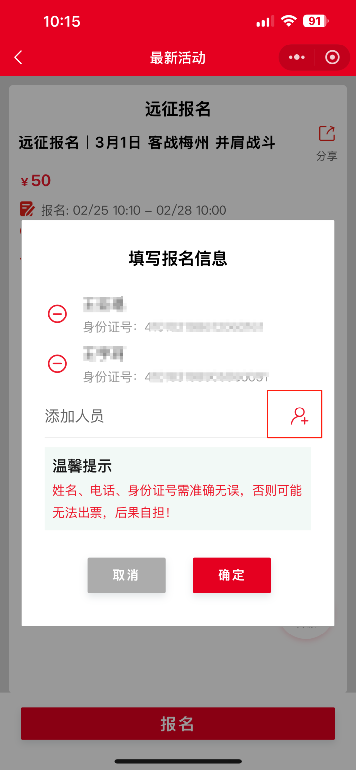 2.请务必在报名时填写准确的姓名、身份证号、手机号等信息,为他人报名请按照图示步骤添加观赛人信息。