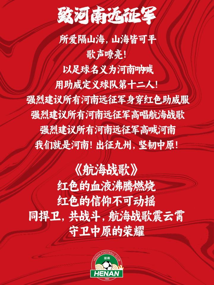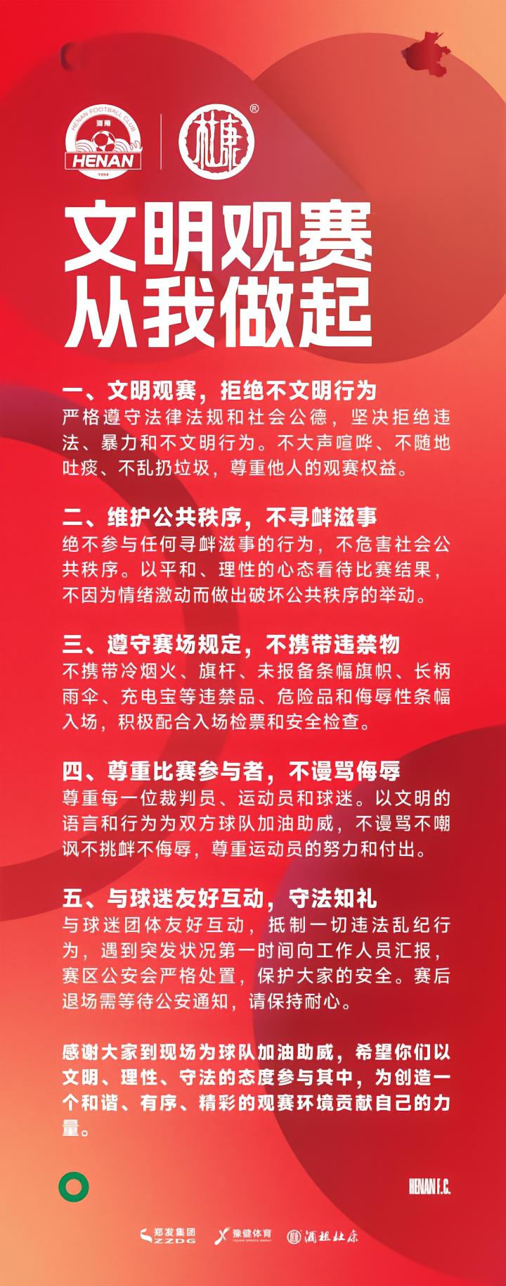 无论您是从异地踏上征途,还是在广东等待集结,让我们以河南球迷的共同身份,为家乡球队倾力呐喊,并肩战斗。更展现出河南球迷的精神风貌,文明观赛,守法知礼。