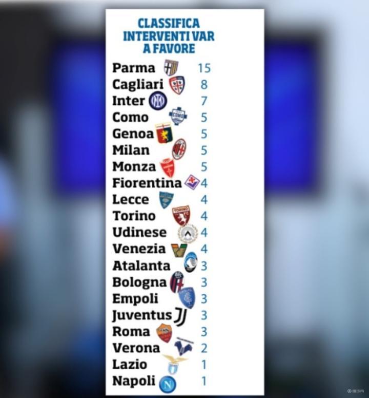 北京时间2月24日,《都灵体育报》统计了意甲本赛季至今因VAR介入受益次数最多的球队,帕尔马15次高居第一,拉齐奥和那不勒斯仅1次排名垫底。