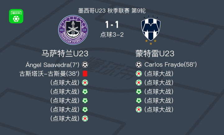 北京时间2月26日,墨西哥U23秋季联赛第9轮,马萨特兰U23主场迎战蒙特雷U23。比赛中,马萨特兰U23的Ángel Saavedra率先打破僵局,为球队取得领先。然而,马萨特兰U23的一名球员随后因严重犯规被红牌罚下,导致球队在人数上处于劣势。蒙特雷U23的Carlos Frayde抓住机会扳平比分。 比赛进入点球大战阶段,双方互有攻守。马萨特兰U23和蒙特雷U23在点球大战中均有多次罚失,但马萨特兰U23最终凭借更稳定的发挥,在点球大战中以4-3战胜对手,赢得了这场激烈的对决。