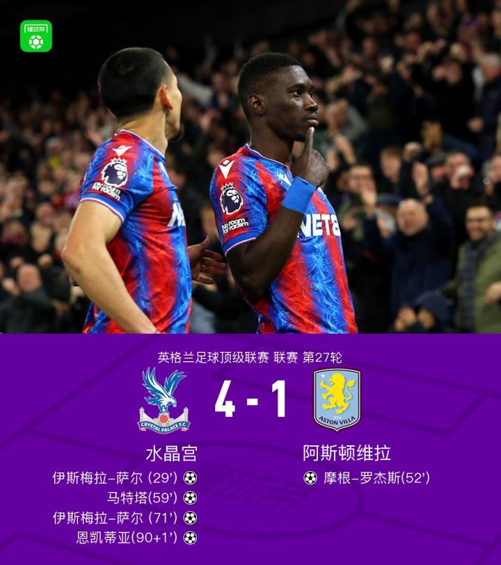 北京时间2月26日,英格兰足球超级联赛第27轮,水晶宫主场迎战阿斯顿维拉。比赛中,伊斯梅拉-萨尔表现出色,独中两元,马特塔和恩凯蒂亚也各入一球,为水晶宫贡献了精彩的表现。阿斯顿维拉方面,摩根-罗杰斯打入一球,但未能扭转局势。最终,水晶宫以4比1战胜阿斯顿维拉,取得了一场令人瞩目的胜利。