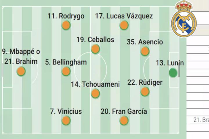 前锋:罗德里戈、维尼修斯、姆巴佩/卜拉欣-迪亚斯
