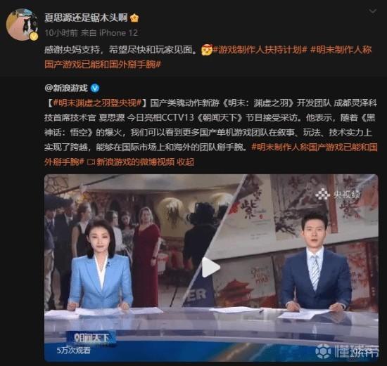 央视播放《明末:渊虚之羽》采访,制作人凌晨发文感谢支持