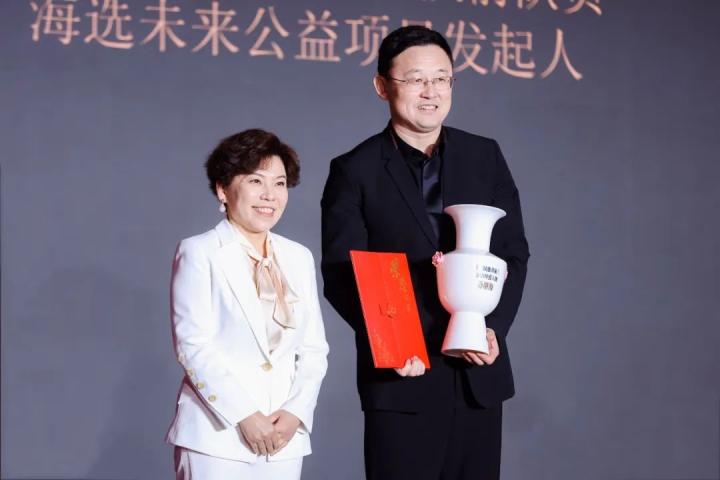 原中国女子乒乓球队运动员、世界冠军、奥运冠军、乒乓球大满贯得主邓亚萍为孙继海颁发《中国慈善家》2024年度人物纪念证书