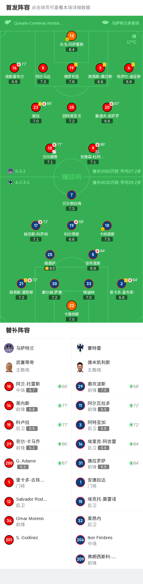 马萨特兰1-0蒙特雷,安德森-杜阿尔特助球队取胜