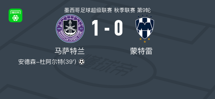 北京时间2月26日,墨西哥足球超级联赛秋季联赛第9轮,马萨特兰主场迎战蒙特雷。比赛中,马萨特兰凭借安德森-杜阿尔特的进球取得领先。最终,马萨特兰以1-0战胜蒙特雷,全取三分。