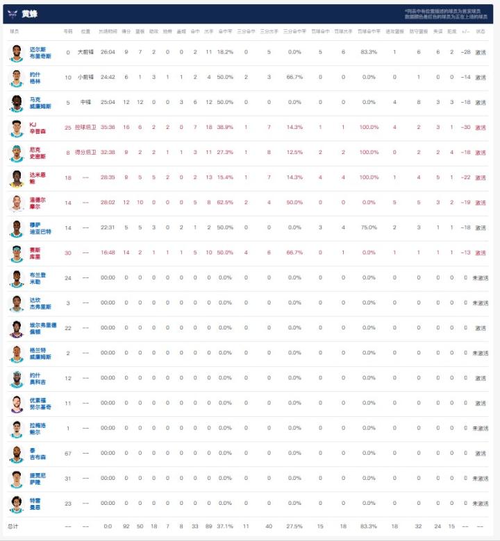 夏洛特黄蜂KJ-辛普森16分6板2助,塞斯-库里14分2板1助。