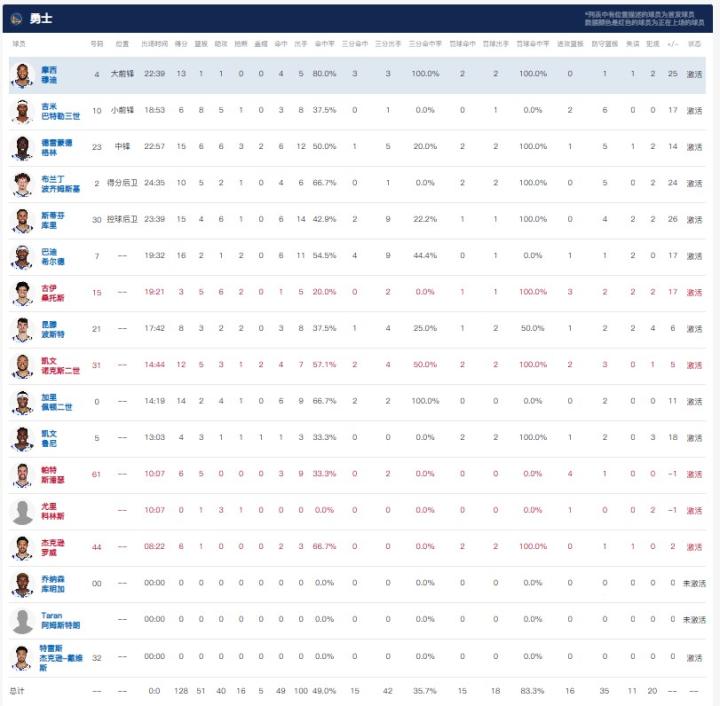 金州勇士希尔德16分2板1助2断,德雷蒙德-格林15分6板6助3断2帽,斯蒂芬-库里15分4板6助1断;