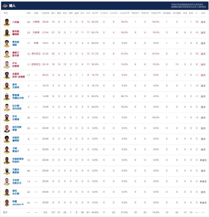 洛杉矶湖人詹姆斯27分12板3助1断,里夫斯20分3板5助,东契奇19分15板12助3断2帽;