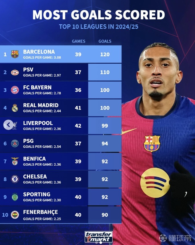本赛季欧洲俱乐部进球榜:巴萨120球领跑,PSV、拜仁前三