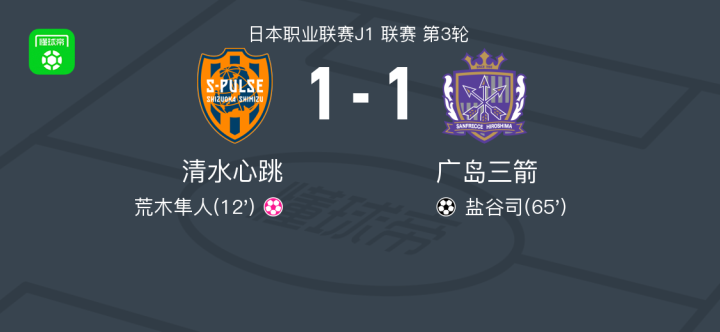 北京时间2月26日,日本职业联赛J1联赛第3轮,清水心跳主场迎战广岛三箭。比赛中,广岛三箭球员盐谷司成功破门,为球队扳平比分;然而,荒木隼人在比赛过程中不慎自摆乌龙,送给对手一分。最终,双方以1-1握手言和。