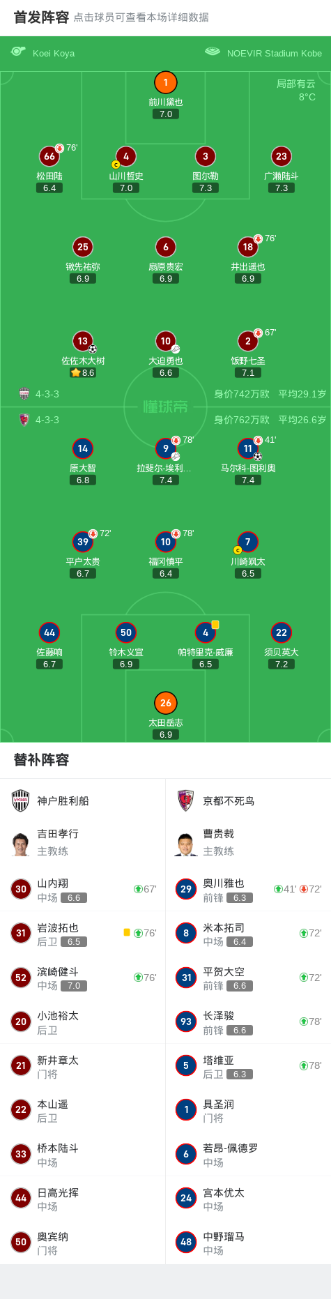 北京时间2月26日,日本职业联赛J1联赛第3轮,神户胜利船主场迎战京都不死鸟。比赛中,京都不死鸟凭借马尔科-图利奥的进球取得领先。随后,神户胜利船在比赛尾声由大迫勇也助攻佐佐木大树扳平比分。最终,双方以1-1握手言和。