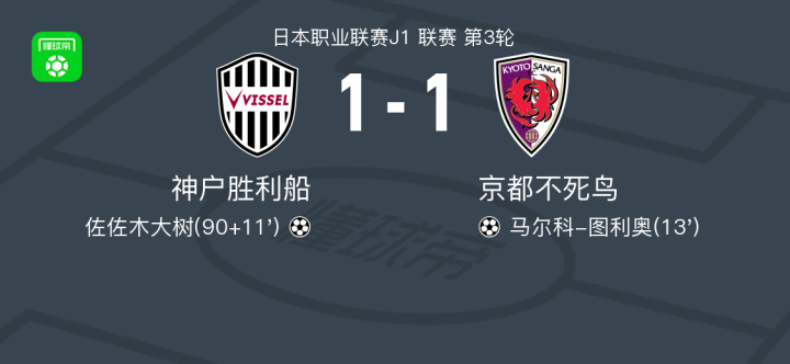 神户胜利船1-1京都不死鸟,马尔科-图利奥破僵,佐佐木大树扳平比分