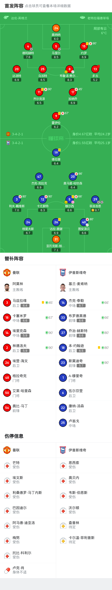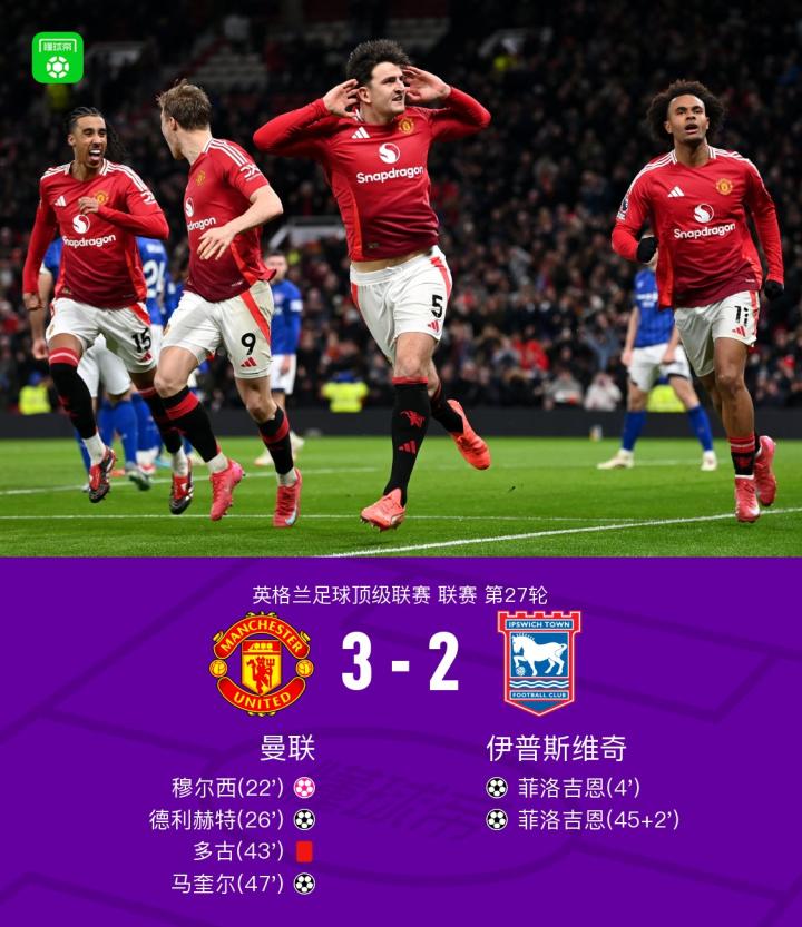 北京时间2月27日,曼联在英超第27轮主场迎战伊普斯维奇。上半场开场仅4分钟菲洛吉恩就利用曼联后场配合失误首开记录,此后穆尔西不慎自摆乌龙以及德利赫特的补射破门帮助曼联反超比分。半场结束前多古严重犯规被红牌罚下,菲洛吉恩再进一球扳平比分。下半场开场不久后布鲁诺-费尔南德斯角球助攻马奎尔破门,最终10人曼联主场3-2击败伊普斯维奇。