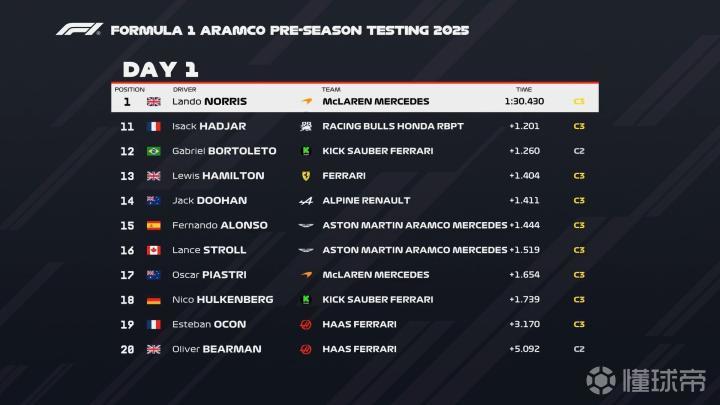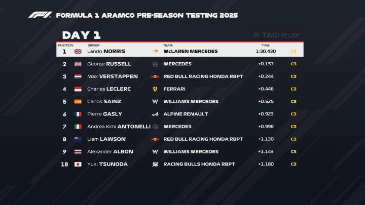 首日测试中,迈凯伦车手诺里斯以1分30秒430的最快圈速占据圈速榜头名,梅赛德斯-奔驰车队的拉塞尔和红牛车手维斯塔潘分别位于第二和第三位,两人与诺里斯的差距均在0.3s之内。
