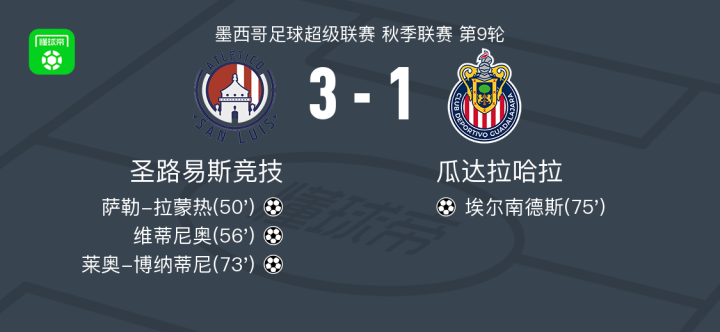 北京时间2月27日,墨西哥足球超级联赛秋季联赛第9轮,圣路易斯竞技主场迎战瓜达拉哈拉。比赛中,圣路易斯竞技表现出色,萨勒-拉蒙热首开纪录,维蒂尼奥随后再下一城,莱奥-博纳蒂尼锦上添花,帮助球队取得三球领先。尽管埃尔南德斯为瓜达拉哈拉扳回一城,但未能改变战局。最终,圣路易斯竞技以3-1战胜瓜达拉哈拉,全取三分。